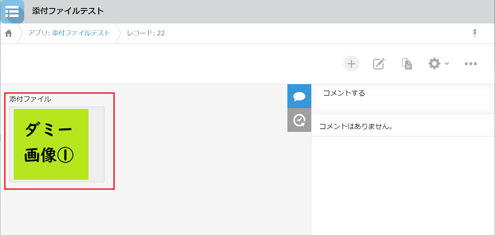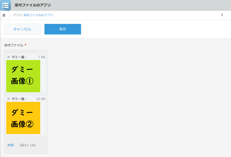 保存ボタンを押すと、レコード内容が保存され、選択されたファイルが添付ファイルフィールドに登録されます。